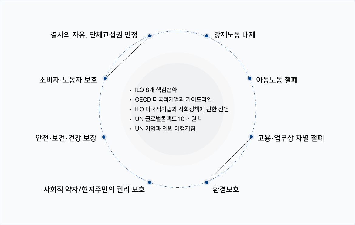 'Do no Harm' 및 Due Diligence' 원칙 하에 UN Global Compact에서는 인권의 주요 영역을 아래와 같이 8개로 구분합니다.